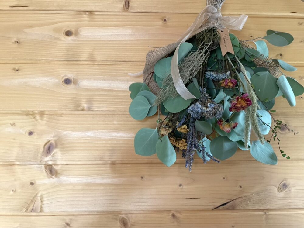 ユーカリは、水分が抜けやすく形も保持しやすいので、初心者の方でも簡単に美しいドライフラワーを作ることができます。フレッシュな段階から飾りながらドライにでき、同時に香りも楽しむことができるため、おすすめの楽しみ方です。