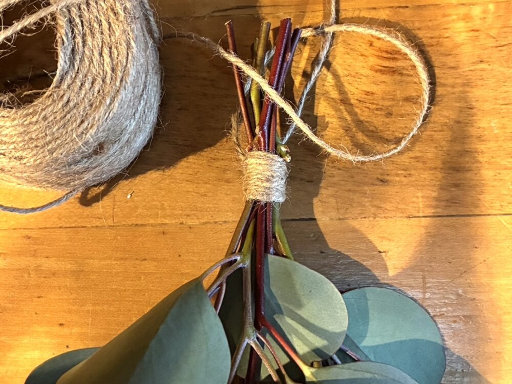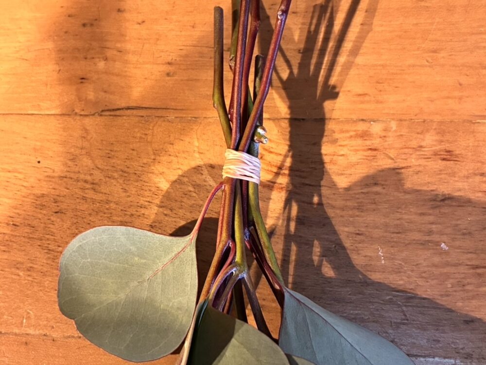 ユーカリポポラスを重ねて、好みの形になったら次は輪ゴムを枝に巻きつけて固定します。